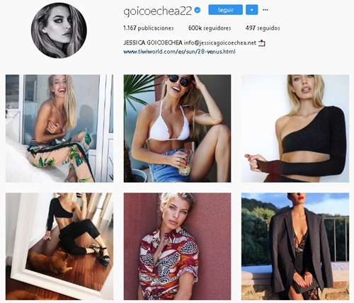 Empezamos por Jessica Goicoechea, una guapísima modelo barcelonesa que ha colaborado con Maybelline, L'Oreal, Topshop y muchas firmas más. Su cuenta de IG le sirve de escaparate. Cada foto que sube tiene más de 40.000 likes.. Tiene aproximadamente 600.000 seguidores en la actualidad, y siguen aumentando!